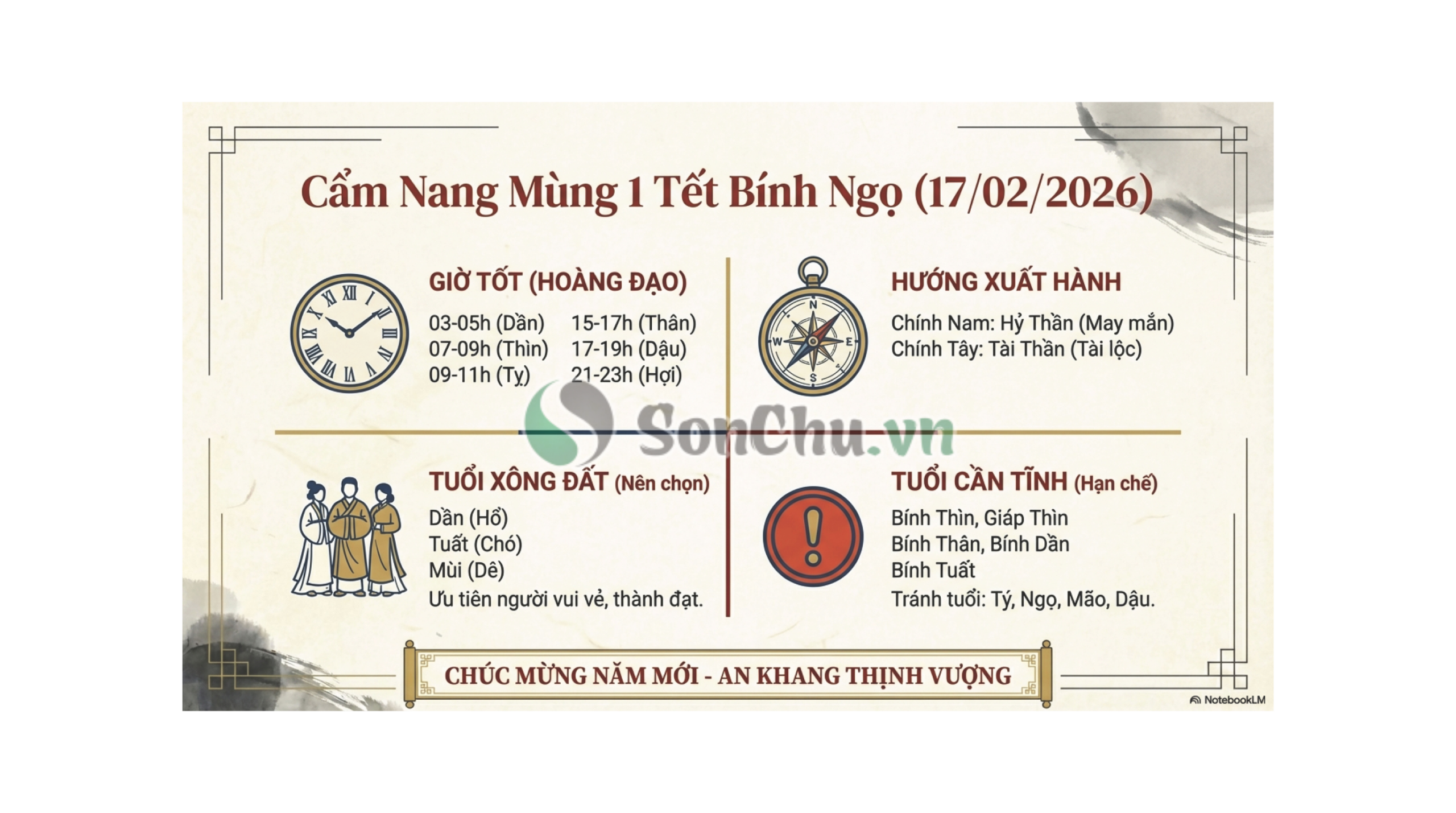Tuy nhiên, việc vận dụng các thông số này cần linh hoạt, phù hợp. Những người tuổi Bính Thìn, Giáp Thìn, Bính Thân, Bính Dần, Bính Tuất nên hạn chế xuất hành hoặc thực hiện các việc quan trọng vào ngày mùng Một để tránh xung khắc khí vận.